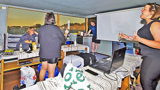 Kansiharjoituksia aluksella, veneilyn perustaitoharjoittelua, merimerkit ja navigointiharjoituksia, saunanlämmitystä ja merellistä ruokailua. Toimii mukavan rennosti pois päivän rutiineista.